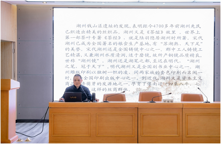 丁国强教授围绕“湖州文化概念、湖州文化名人概述、湖州历史文化特征三个方面”展开论述,着重讲授了湖州文明发展史,湖州在文化史上的重要地位、湖州历代文化名人生平事迹和群体特征等内容。丁教授的讲座结合详实的史料、丰富有趣的名人故事和经典的文学作品,引经据典、谈古论今,以通俗易懂的语言对“飘逸、柔美、细腻”的湖州历史文化做了深刻的诠释和解读。