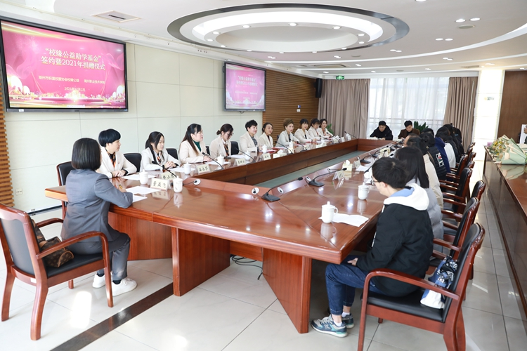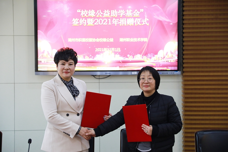 12月1日下午,学校举行“校缘公益助学基金”签约暨2021年捐赠仪式。湖州市织里镇校服协会校缘公益彭红霞女士一行11人、学校学工部负责人、相关学院学生工作负责人、相关工作辅导员、6名受资助学生参加了仪式。