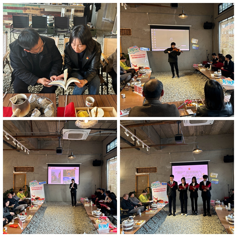 宣讲活动现场氛围感满满。“一条大河波浪宽,风吹稻花香两岸……”经济管理与电商学院陆星缘同学带来的小提琴独奏《我的祖国》拉开了本场活动的序幕,悠扬的曲调立刻点燃了大家宣讲的热情。接着,活动正式进入核心环节。湖州本土文化学者、闻波社区82岁老退休干部沈鑫元分享了习近平总书记考察浙江重要讲话精神的内涵和意义,从深刻领会习近平总书记考察浙江的里程碑意义、习近平总书记对浙江的深情大爱、习近平总书记为浙江量身制定的“八八战略”带来的精彩蝶变,引发了在场人员的强烈共鸣。吴兴区政协委员、湖州市中医院泌尿外科副主任医师姚丽娟解读了新时代群众路线的重要性和枫桥经验的现实意义,她从自身工作的岗位出发,分享了贯彻落实党的群众路线,坚守医者仁心,努力做好群众健康的守护人的具体实践。经济管理与电商学院“筑梦经声”大学生理论宣讲团的三位同学围绕《推进乡村振兴,共创共富蓝图》、《解码义乌商贸城发展经验》、《从新时代群众路线看枫桥经验》,从“小切口”宣讲大主题,以小故事阐释大道理,以青年大学生视角带来了生动的“理论盛宴”,引发了强烈共鸣和阵阵掌声。活动最终在经济管理与电商学院、社会发展与公共教育学院同学带来的《诗颂中华》的激昂朗诵中画上了完美句号。