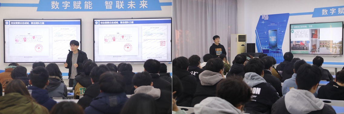 软件2103班雷新钰在校期间成绩始终位列班级前列,先后荣获学校一等奖学金、浙江省政府奖学金、学校青年大学生“五四”奖章等多项荣誉,在即将过去的2023年,他收获了10项省级三等奖以上技能竞赛成果,其中省级一A类一等奖5项,目前他创办了公司并入驻学校创业园。分享会上,他从创业、竞赛、学业三个方面的成果和学弟学妹进行分享,并鼓励学弟学妹要善于挖掘市场潜力,寻找突破口;要有足够的热情、热爱,做事情要耐得住性子、沉得下心,学会聚合团队的力量。