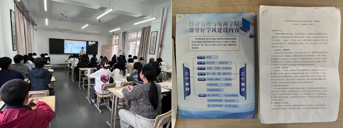为进一步落实立德树人根本任务,切实推进学院学风建设,营造良好的期末复习氛围。近日,经济管理与电商学院多渠道开展了学风建设系列活动,通过主题班会兴学风、课堂规范促学风、定期巡查正学风,向全体同学发起优良学风建设倡议,组建师生队伍常态化开展学风巡查,多措并举强化学生“愿学、善学、乐学”的思想和行动自觉。