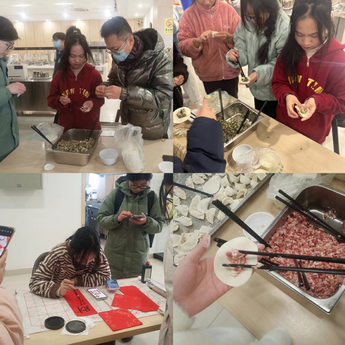 当天下午,食堂暖意融融,同学们早早来到现场,准备大显身手。活动包括师生包饺子比赛、趣味知识竞赛、创意饺子拼盘比赛、吃饺子比赛。活动还邀请了汉墨书法社团的同学现场书写对联,每场比赛的优胜者都可以现场定制属于自己的对联。同学们的热情高涨,擀面皮,包饺子,一个个“奇形怪状”的可爱饺子诞生了,大家都有说有笑,分享包饺子的经验,交流学习经验,场面十分热闹。