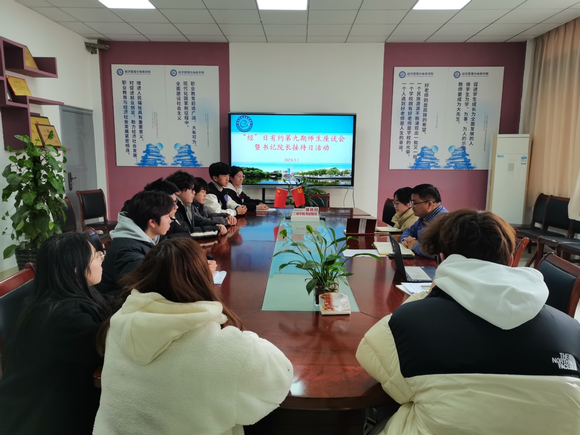 新学期伊始,为及时、全面、深入、准确了解学生思想动态,增进师生的沟通与交流,精准化做好学生思想政治引导工作,增强思想政治教育工作实效,3月1日下午,学院举办“经”日有约第九期师生座谈会暨书记院长接待日活动。学院党总支副书记、学工办主任、辅导员参与本次座谈会,与2023级各班班委代表进行了深入交流,了解新学期学生思想动态。