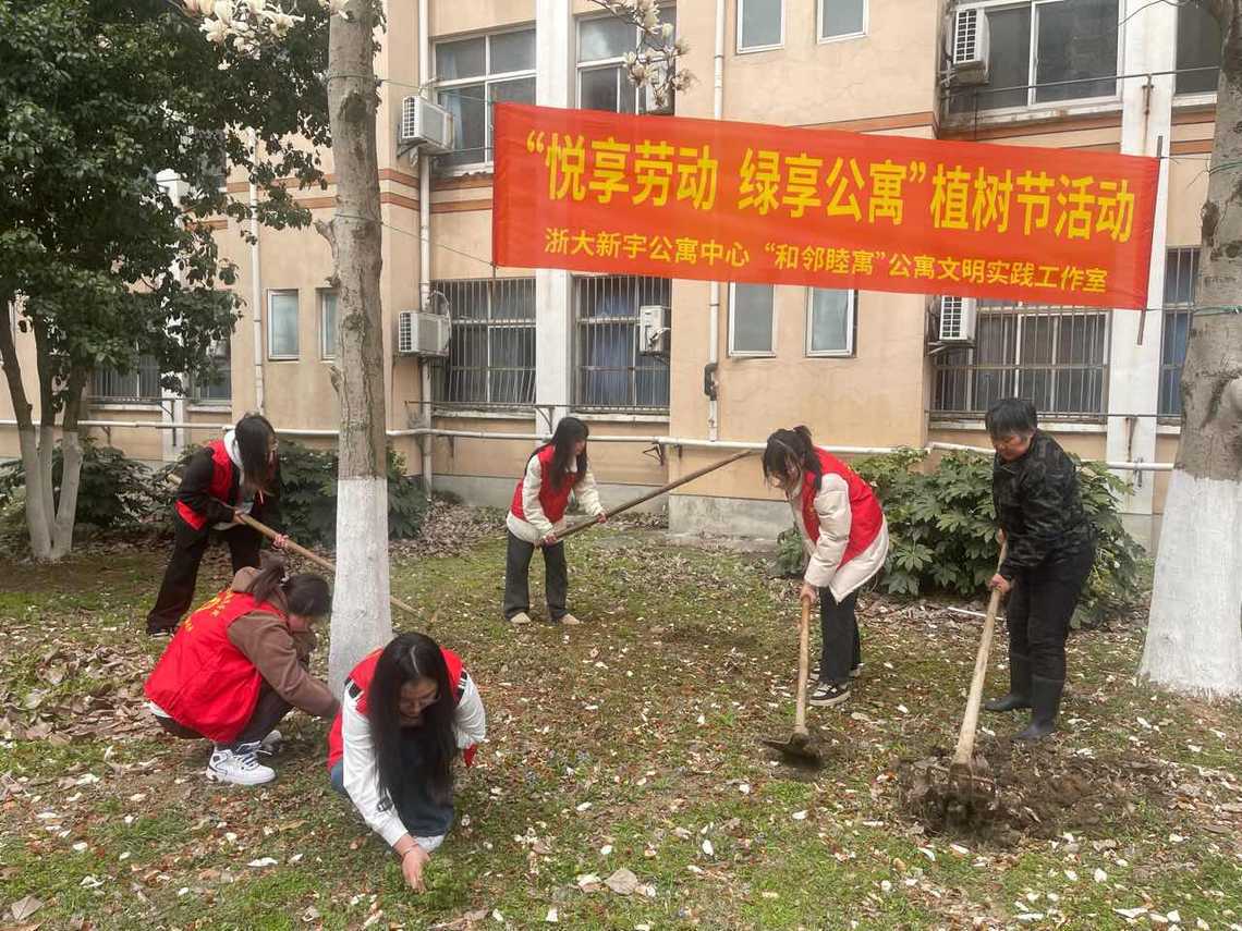 春回大地,万物复苏,植此新绿,不负春光。3月12日植树节当天,“和邻睦寓”公寓文明实践工作室联合浙大新宇物业公寓中心共同举办“悦享劳动,绿享公寓”植树节劳动教育活动。