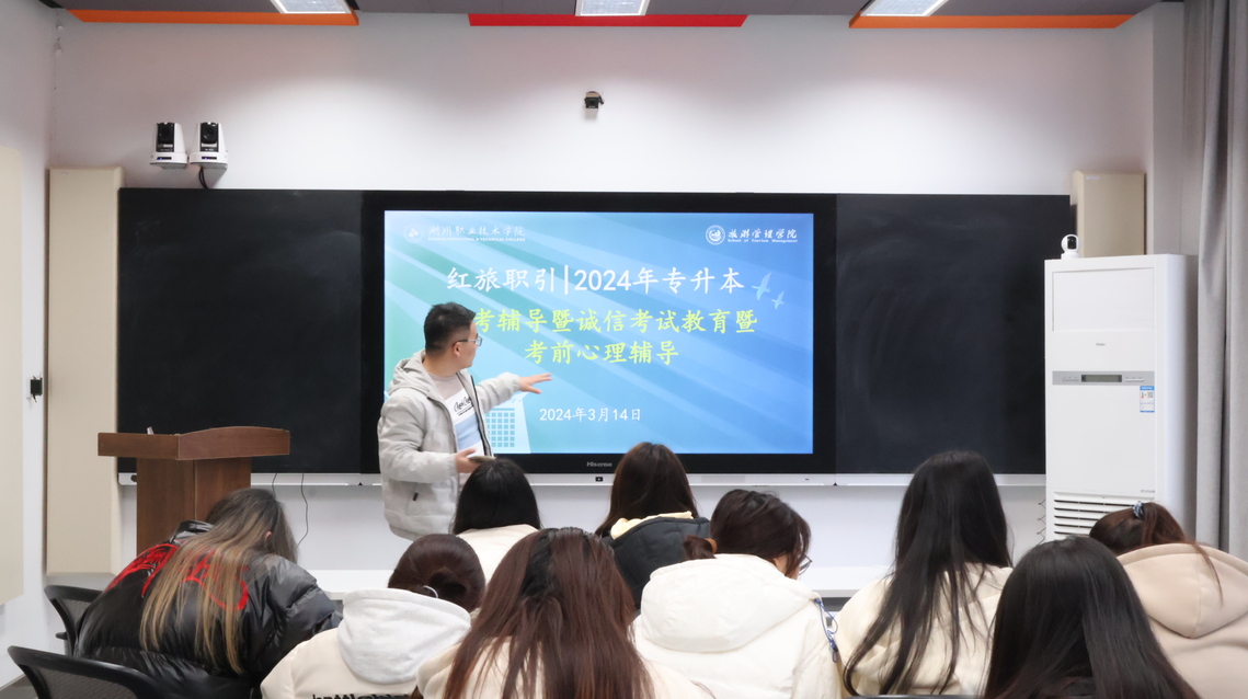 为保障2024届毕业生专升本报考工作,加强考生诚信教育和考前心理辅导,2024年3月14日下午,旅游管理学院在6336教室举行专升本报考辅导暨诚信教育和考前心理辅导,学院就业辅导员、心理辅导员和40名学生代表参与。