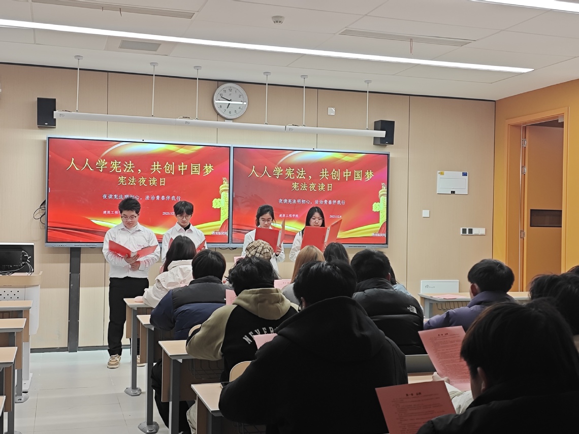 为深入学习宣传宪法,引导大学生感悟宪法精神、熟知权利义务,强化法治思维与责任担当,12月4日晚,建筑工程学院开展“人人读宪法,共创中国梦”宪法夜读活动。全体参与学生在沉浸式的夜读氛围中,将宪法意识内化于心、外化于行。