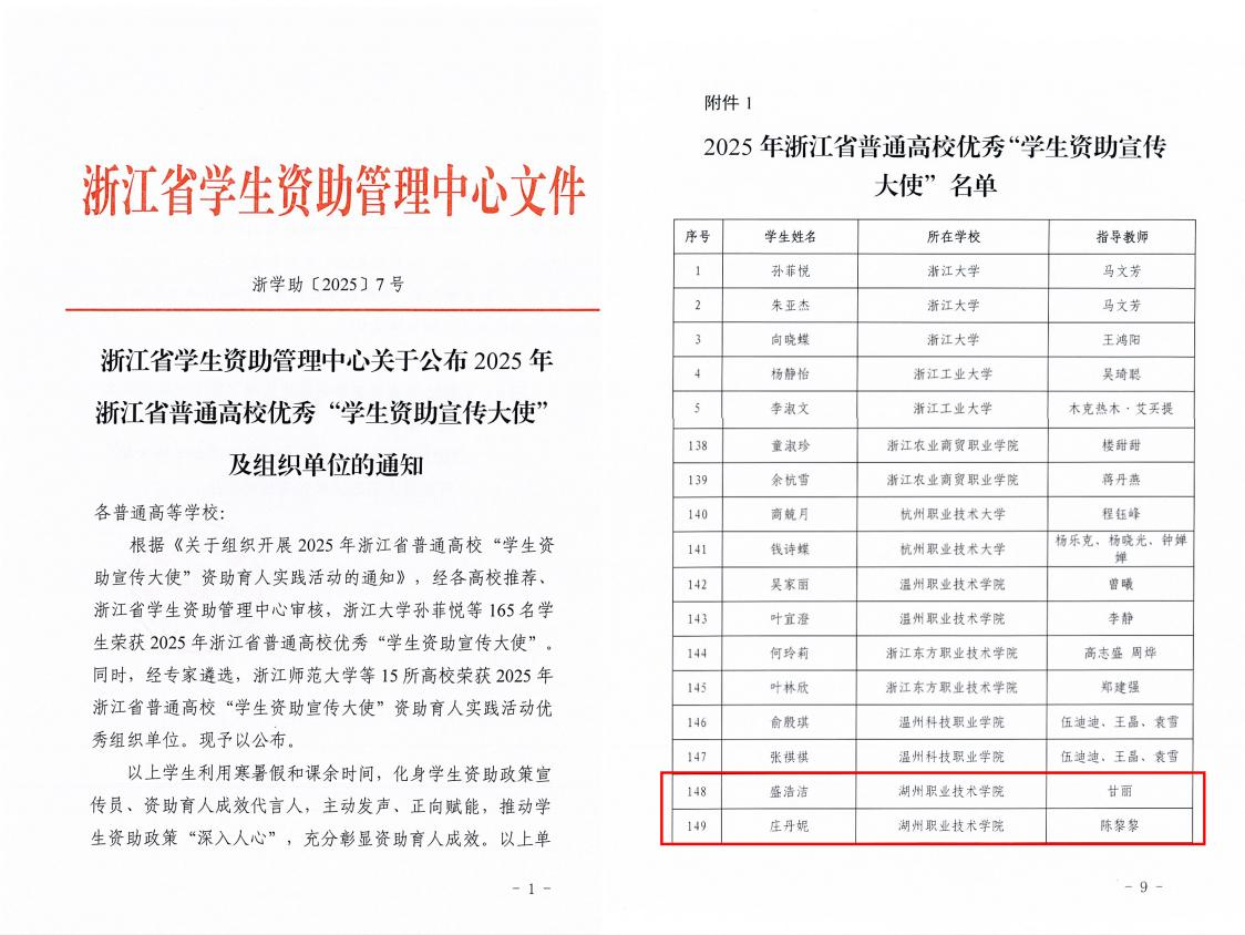 为提升学生资助宣传教育的覆盖广度与育人实效,激励青年学子深入社会、感知国情,增强社会责任感、感恩意识与实践能力,浙江省学生资助管理中心于今年5月启动了2025年普通高校“学生资助宣传大使”资助育人实践活动。近日,评选结果正式揭晓,我校盛浩洁、庄丹妮两位同学荣获2025年浙江省普通高校优秀“学生资助宣传大使”称号。
