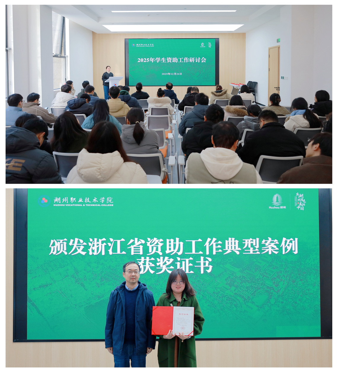 李晓俊副书记全程听取了会议报告,并在会上为获得2025年浙江省学生资助工作典型案例的丁雪老师颁发获奖证书,向各学院资助辅导员代表赠阅《浙江省高校学生资助工作文件选编》。
